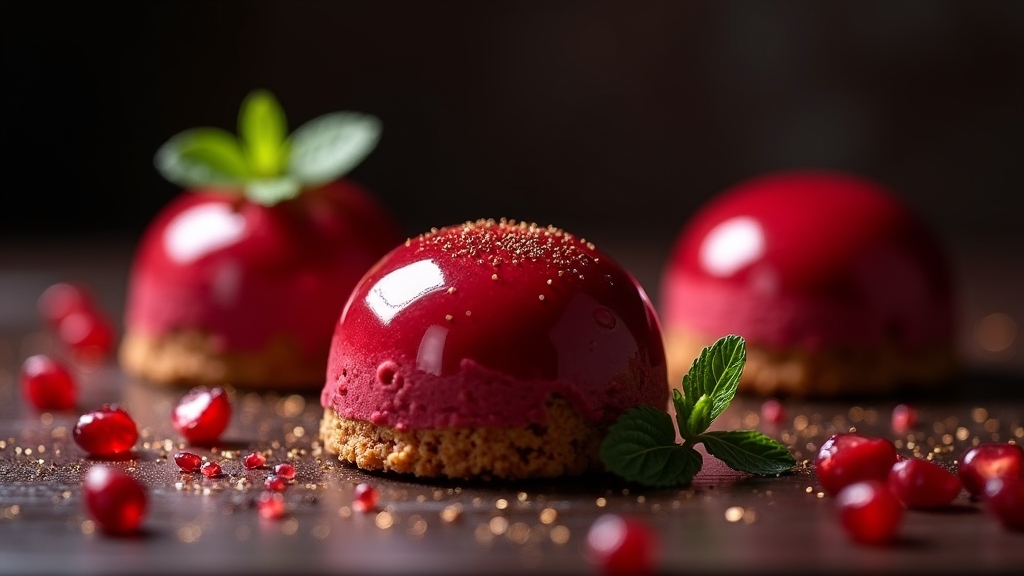 In a mixing bowl, combine softened cream cheese, granulated sugar, vanilla extract, and sour cream until smooth. In a separate bowl, whip the heavy cream until stiff peaks form and gently fold it into the cream cheese mixture. Pour the filling into dome molds and freeze until solid, about 4 hours. Meanwhile, melt the chocolate chips and coat the inside of the molds. Once the cheesecake is frozen, carefully remove them from the molds and dip each dome in the remaining melted chocolate. For the glaze, mix the red fruit puree with gelatin dissolved in water, then pour over the chilled domes. Let set in the refrigerator for at least one hour before serving.