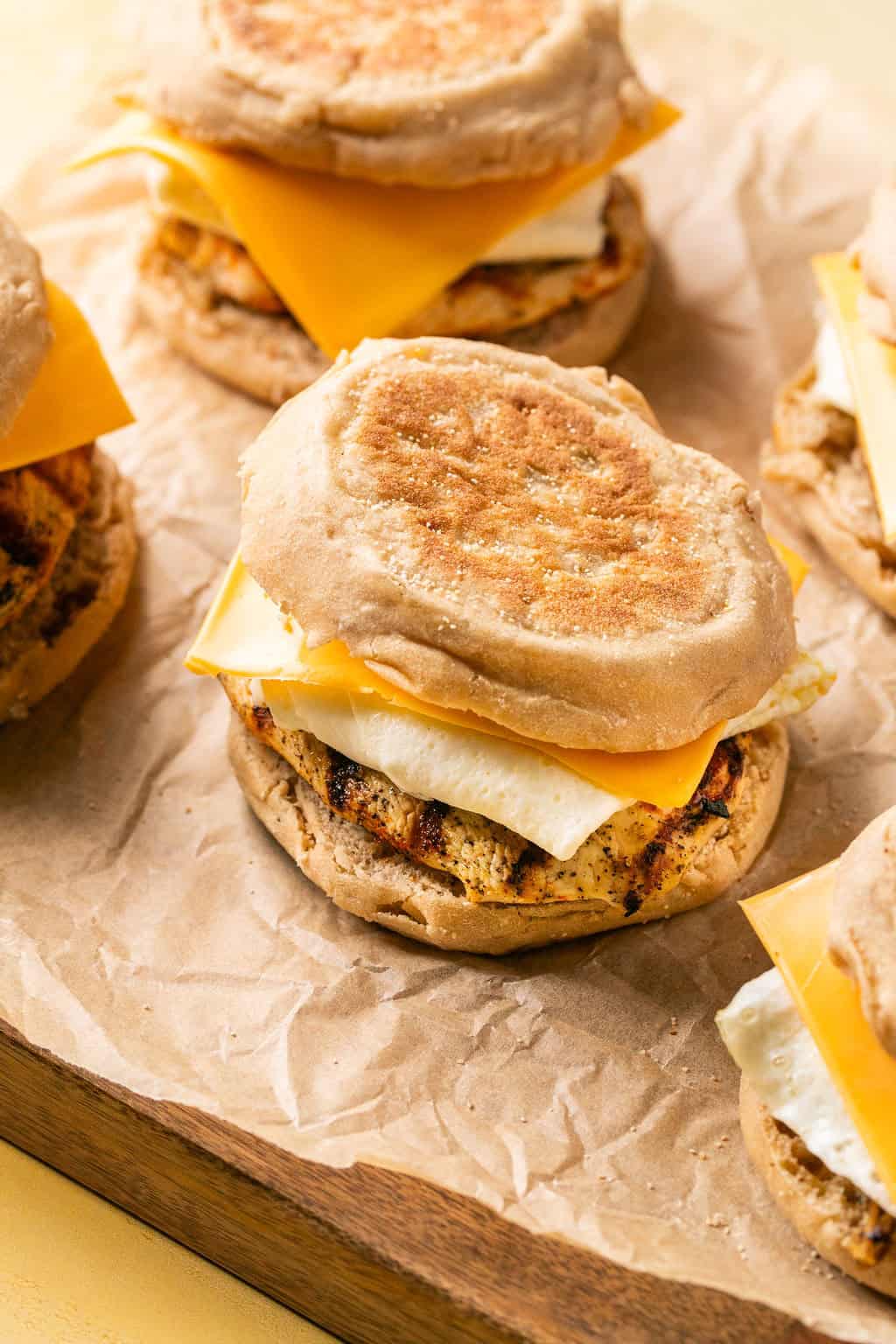 7. Add the sliced chicken and cheese, then top with the other muffin half.