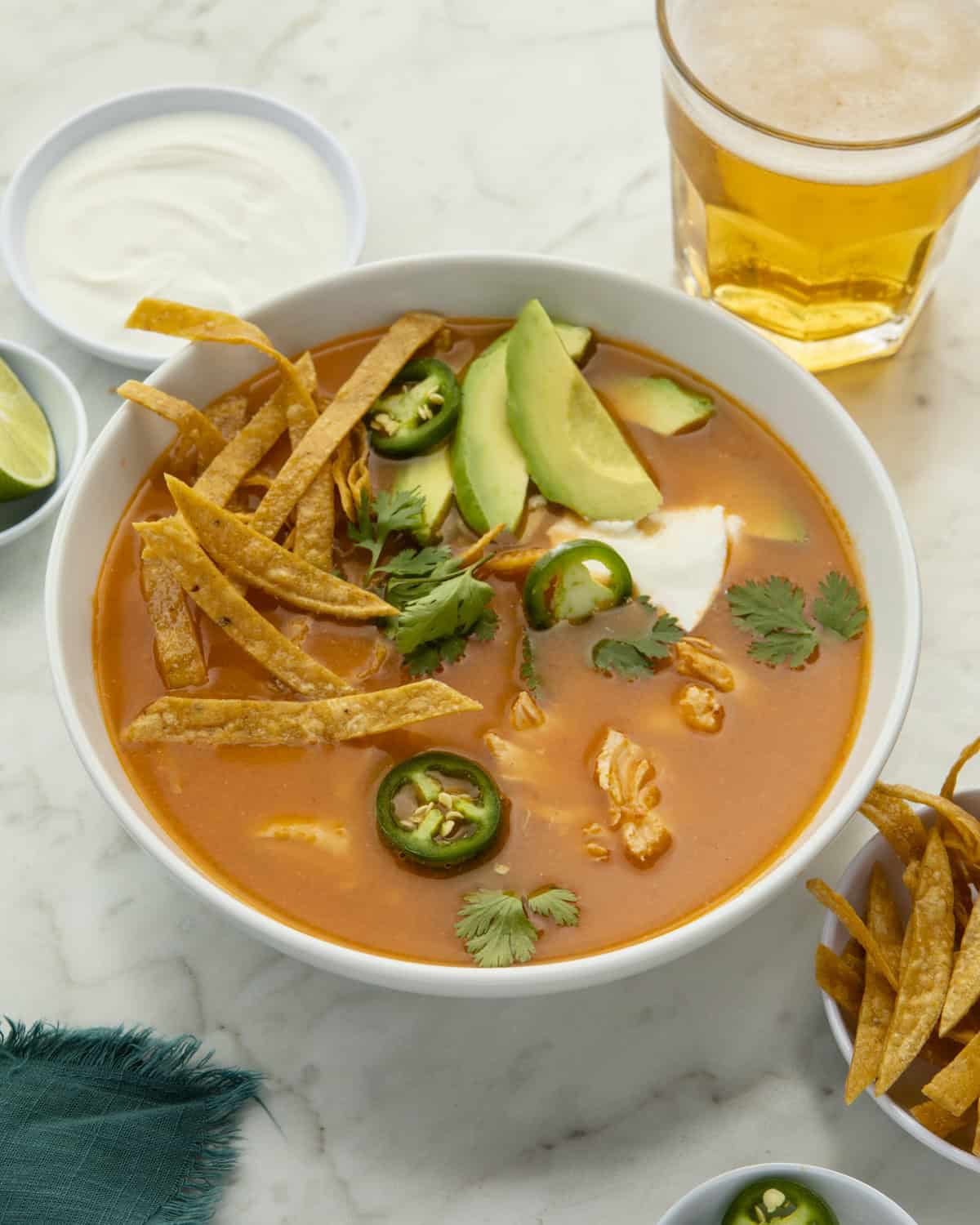 - Serve: Ladle into bowls and top with tortilla strips, avocado, cilantro, cheese, and sour cream.