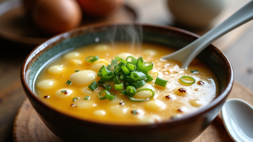 - Add the eggs: In a separate bowl, lightly beat the eggs. Slowly drizzle the eggs into the simmering soup while stirring gently in one direction with a fork or chopsticks. The eggs will cook instantly into silky ribbons.