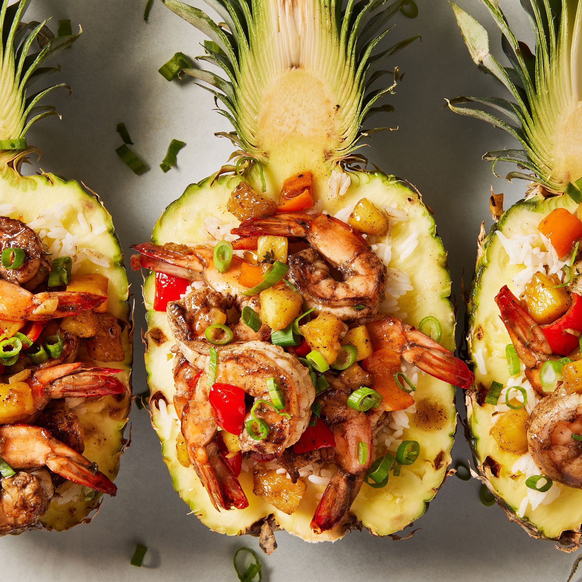 - Fill pineapple bowls with rice, then top with chicken, shrimp, bell pepper, avocado, and pineapple chunks.