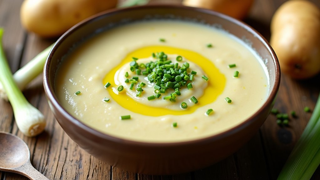 When I think about the history of potato leek soup, I can’t help but be fascinated by its humble beginnings and how it has evolved over time. Rooted in French cuisine, this dish stems from rustic origins, where simple ingredients were transformed into something magical. Leeks and potatoes, often found in the gardens of rural households, became staples due to their accessibility and flavor. As the soup gained popularity, it traversed borders, adapting to local tastes and culinary innovations. Each version tells a story, reflecting the culture and creativity of the region. Today, this classic soup continues to inspire chefs and home cooks alike, inviting us to explore and reinvent its timeless charm in modern kitchens.