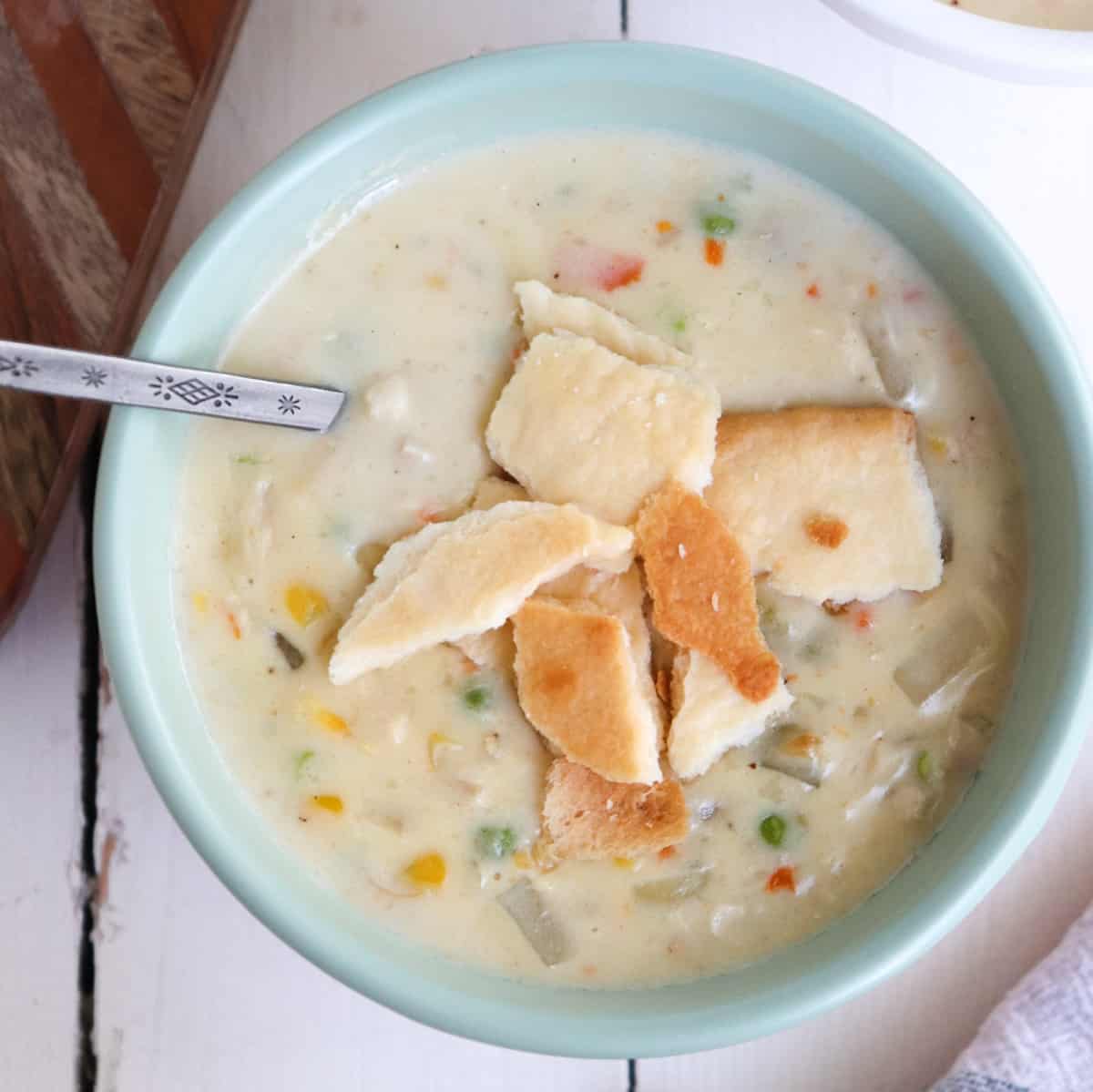 - Bake puff pastry or pie crust separately until golden. Cut into pieces and serve on top of the soup for a pot pie feel.