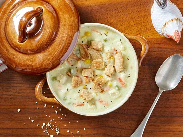 - Bake puff pastry or pie crust separately until golden. Cut into pieces and serve on top of the soup for a pot pie feel.