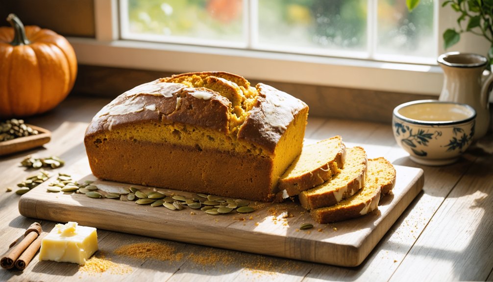 Ah, the eternal quest for freshness! Your pumpkin bread’s shelf life is about three days at room temperature. For longer enjoyment, embrace storing tips: wrap it tightly and refrigerate, preserving its delightful essence for up to a week.