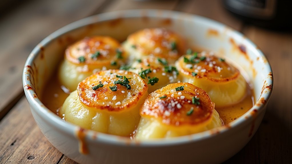 After stacking those delectable layers of potatoes and cheese, it’s time to bring everything together with a rich cream mixture. I whisk together heavy cream, a sprinkle of salt, and freshly cracked black pepper until I achieve a silky cream consistency. This isn’t just any cream; it’s the key to flavor enhancement that’ll elevate our dish from good to unforgettable. Pour the mixture evenly over the layered potatoes, letting it seep through every crevice, ensuring each bite is creamy and flavorful. I love watching it pool around the cheese, promising a luscious texture. This step is where the magic happens, as the cream melds with the other ingredients, creating a harmony that’ll leave everyone craving more.