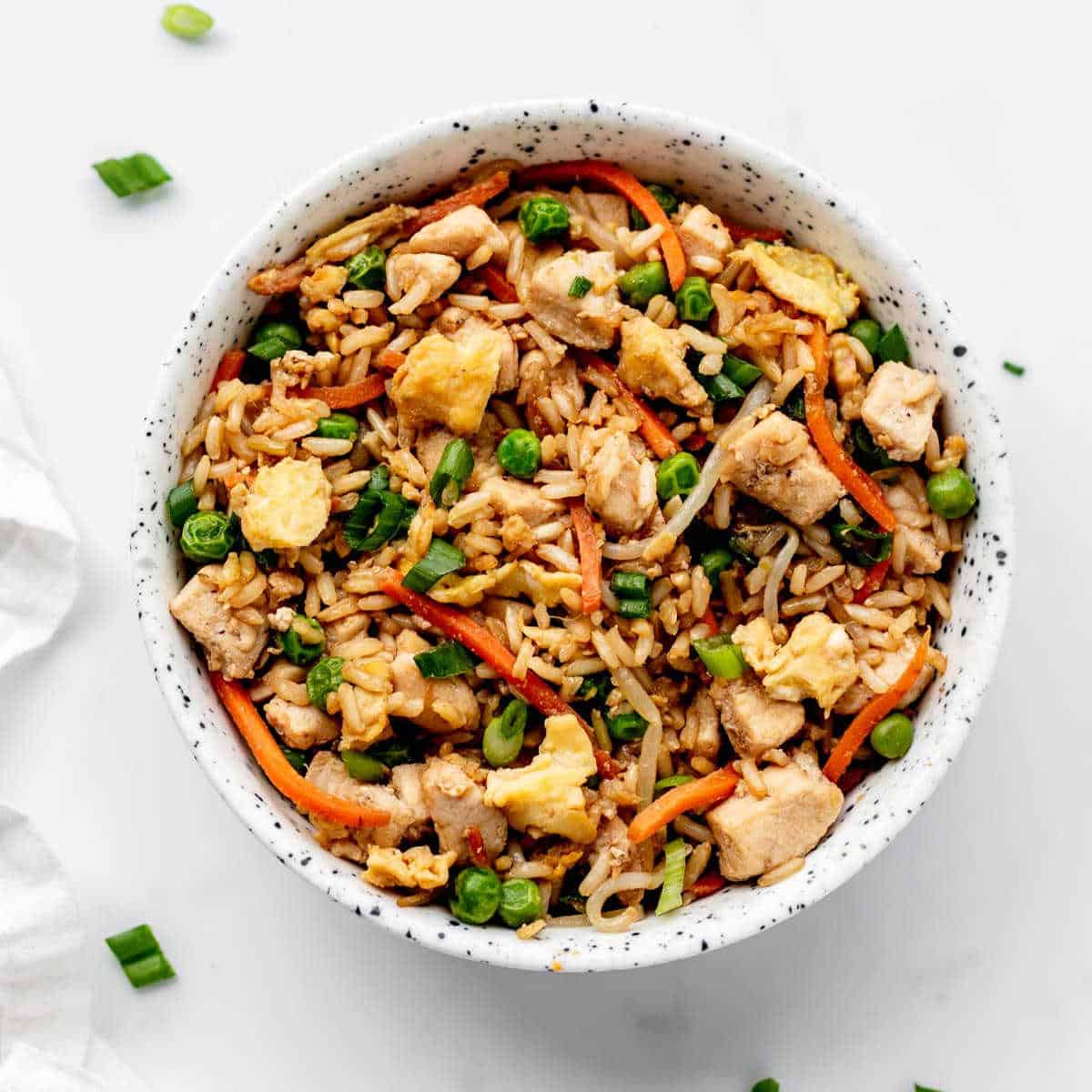 Dice chicken, chop veggies, and beat eggs. Use cold, day-old rice for best texture.